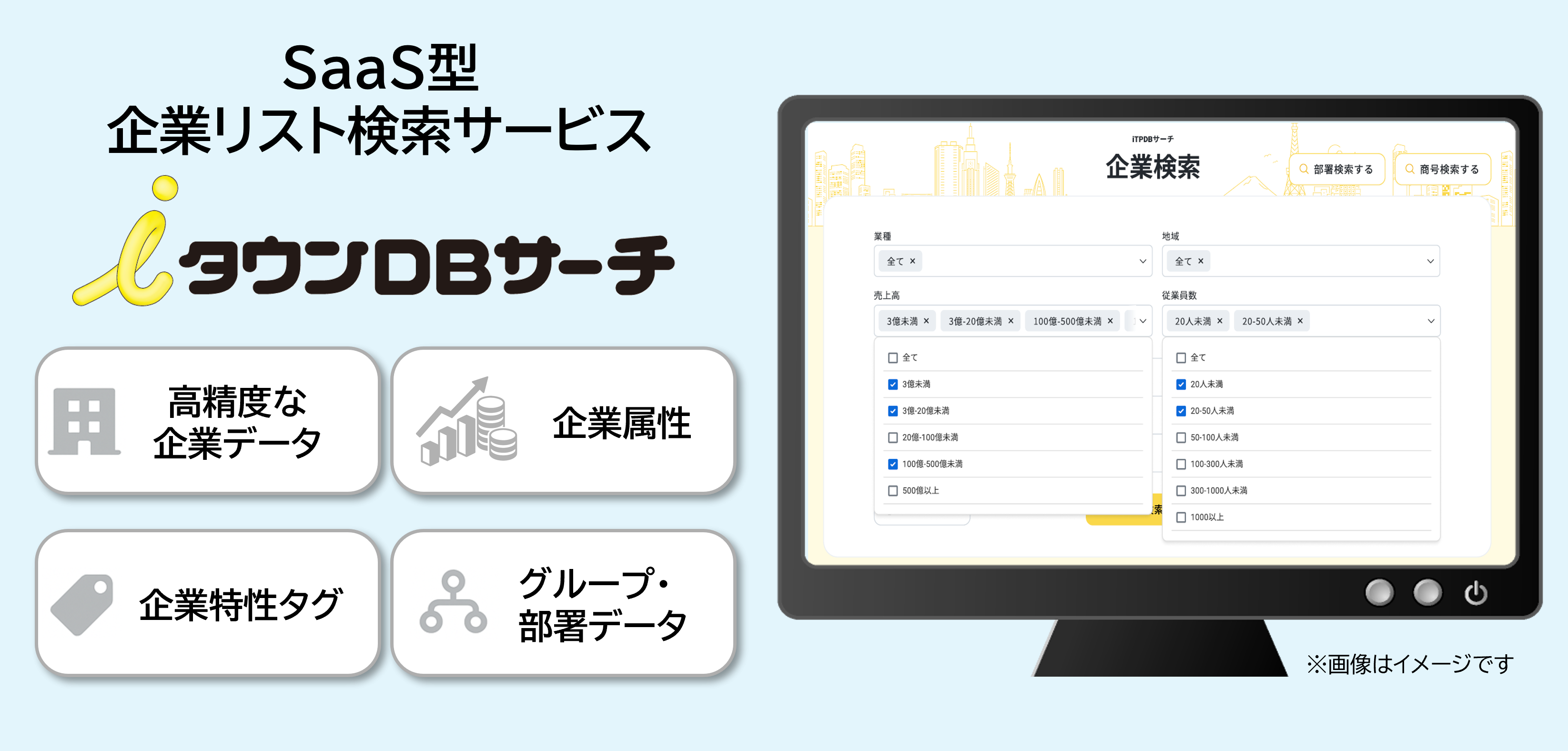 全国の企業・事業所情報を収録したiタウンDB (iタウンページデータベース)を活用したSaaS型企業リスト検索サービス「iタウンDBサーチ※1※2」の販売を開始いたします。