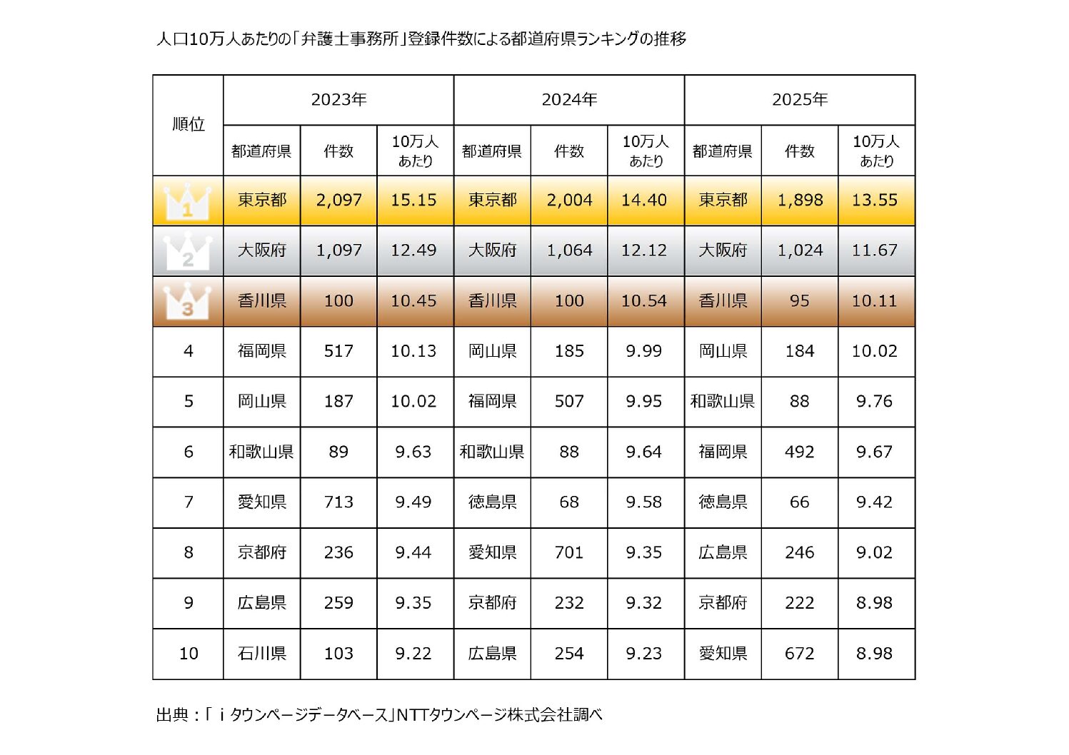 ■対象期間と抽出方法:2023年・2024年・2025年の各3月時点で、iタウンページデータベースの業種分類「弁護士」に登録されている件数を集計し算出。