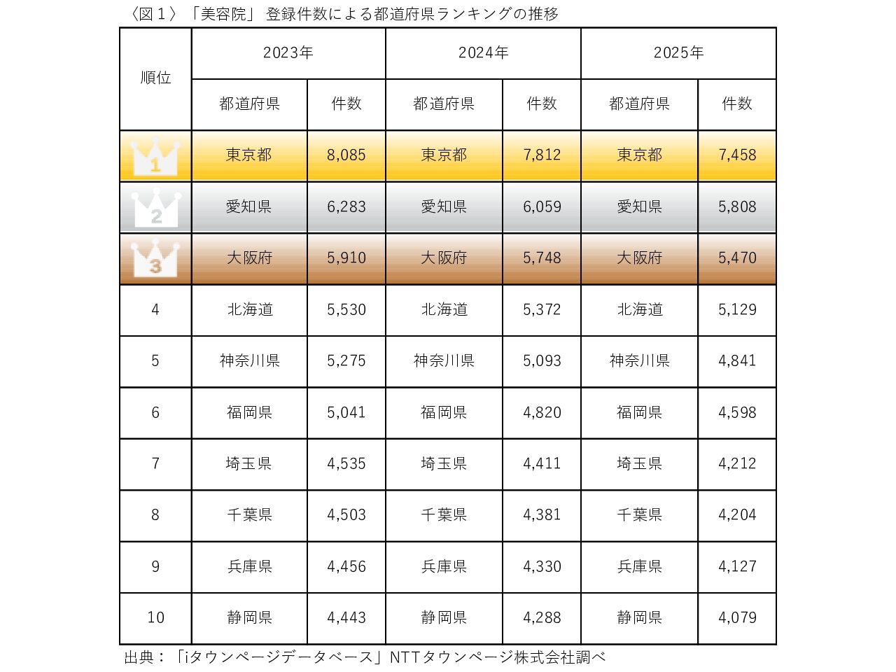 2025年における美容院の登録件数の多い都道府県は、1位が東京都、2位が愛知県、3位が大阪府となりました。これら3地域を含む上位10地域は、2023年から順位を維持しています。