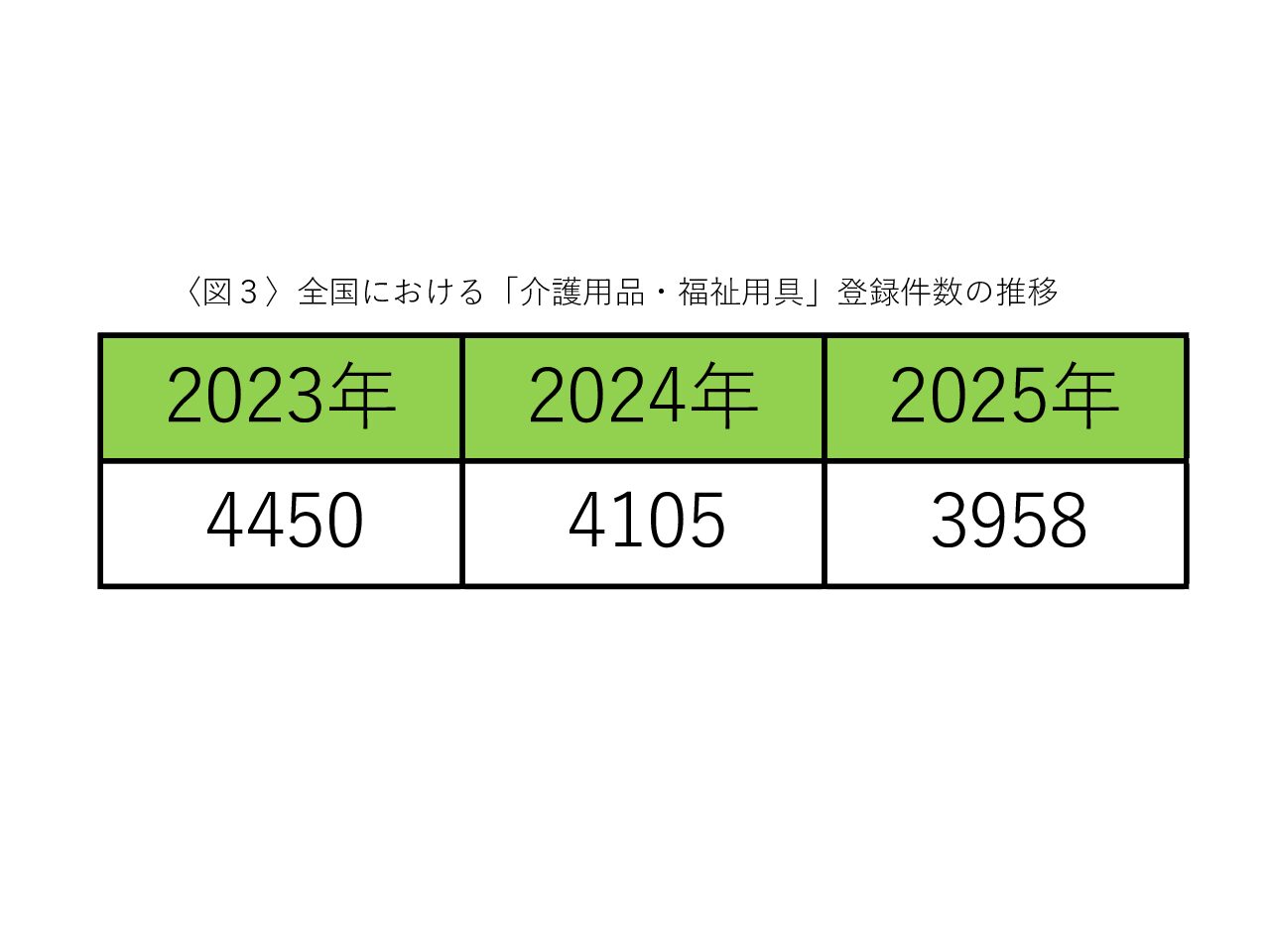 2025年における介護用品・福祉用具の登録件数は前年から減少しており、2024年から2年連続で減少していることがわかりました。2025年の登録件数は前年比で約3.6%減、2023年時点と比較すると11.1%減少しています。
