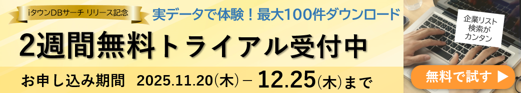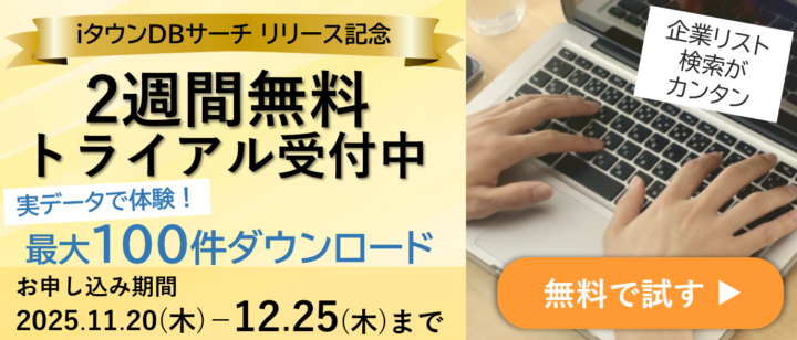 今回ご紹介したランキングは、「iタウンページデータベース」から抽出した情報をもとに作成されています。iタウンページデータベースは「地域」と「業種」で調査対象を絞り込み、データ項目を抽出できるサービスです。法人名や電話番号、住所などさまざまな情報を収集できるため、ターゲットリスト(営業の訪問リストやダイレクトメールの送付リスト)としてもご活用いただけます。