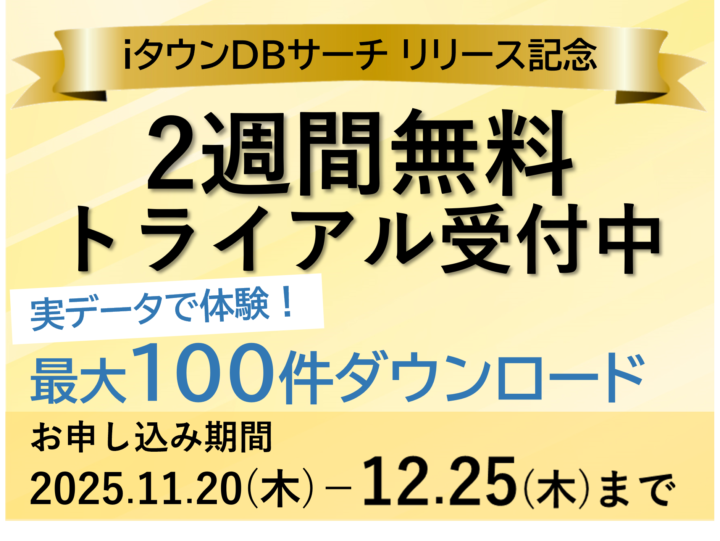 | 注意事項 | ・本トライアルは1社につき1回限りのご利用となります。 ・企業リストはCSV形式での提供となります。 ・本トライアルで取得した企業情報は、iタウンDBサーチのサービスの価値をご確認いただくためのものであり、営業活動や第三者への提供などの活用は禁止させていただきます。 ・iタウンDBサーチ利用規約の仕様料金に関する条項(第9条、第10条、第11条)は、本トライアルにおいては適用外となります。 |