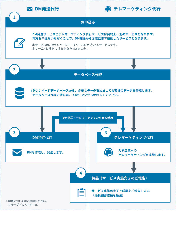 iタウンページデータベースの提供だけではなく、お客さまのご要望によりDM発送代行やテレマーケティング代行の実施まで、一連の販売促進業務をワンストップでご提供するサービスです。
