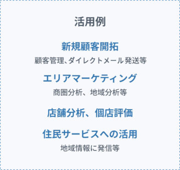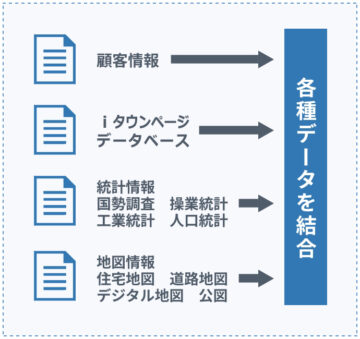 地理情報や空間データをまとめたGISに、iタウンページデータベースと、各種統計情報データベースを統合して、新規顧客開拓、エリアマーケティングなどに活用できるサービスです。